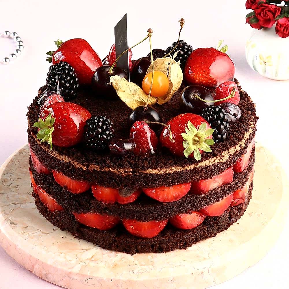 A cake with forest fruit, strawberry and chocolate chips filled with profiteroles sauce and chocolate ganache, consisting of Devil’s Cake layers.