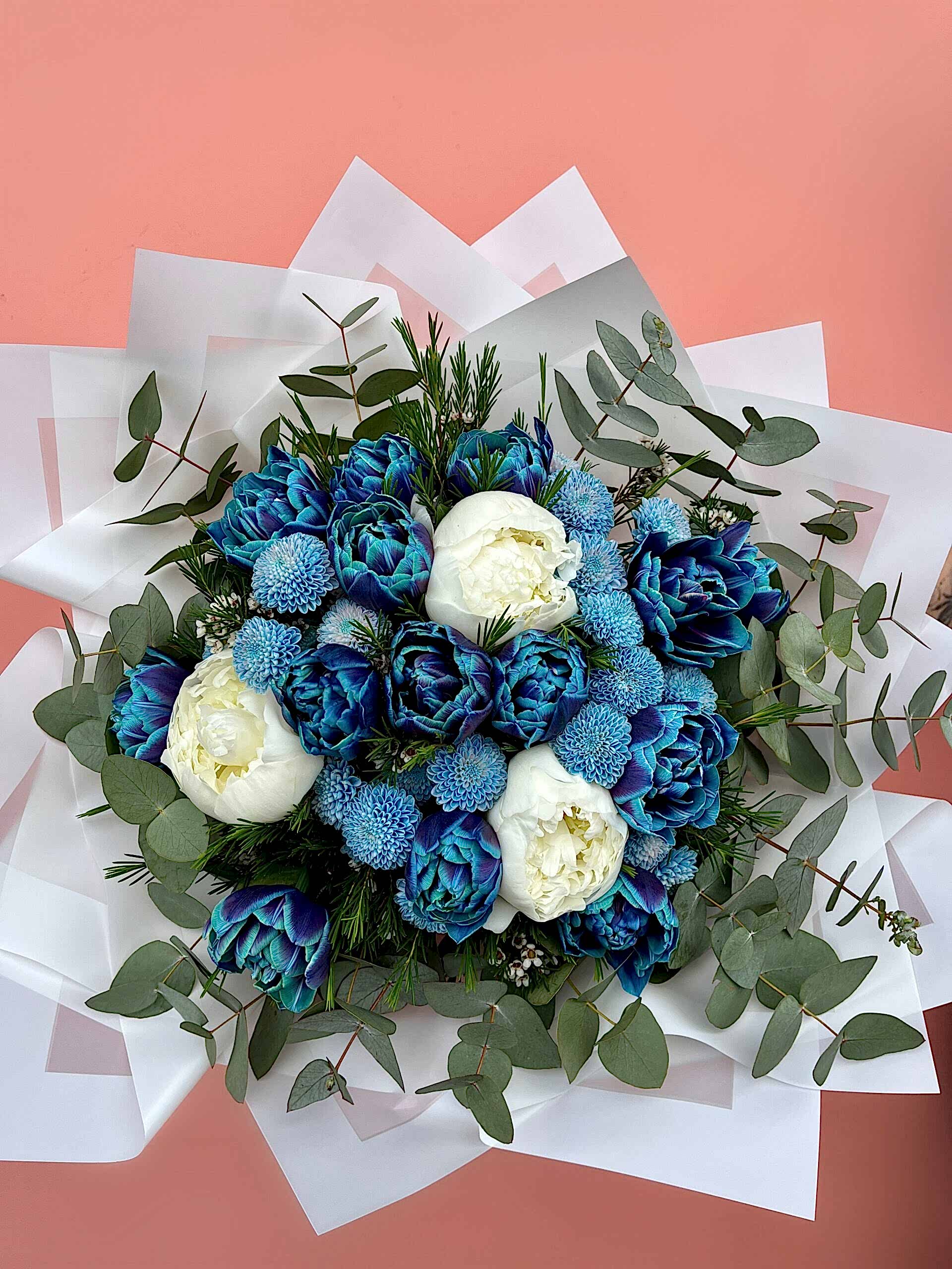 You can make your loved ones happy with 15 vip blue sky tulips, 5 vip mermaid chrysanthemums, 3 imported white peonies and special flowers that make up a Blue Love bouquet prepared with seasonal greens.