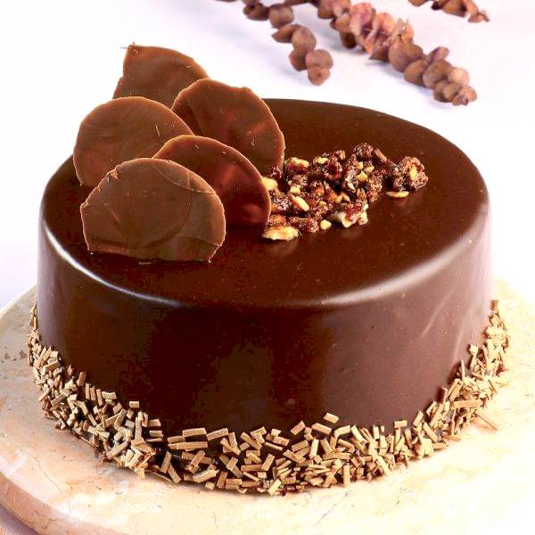 Chocolate ganache and chocolate ganache between layers of cocoa sponge cake, with lots of croquant, covered with dark chocolate sauce on the outside.