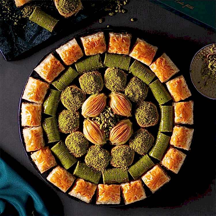 The delicious taste of pistachio is produced by combining thin phyllo dough for baklava. These tastes, shaped by masters, are combined on the Special Pistachio Baklava tray and prepared for you. This tray includes Pistachio Baklava, Pistachio Wrap, Pistachio Mussel Baklava, Walnut Palace Wrap. These flavors, which cheer up the stomach with both their appearance and taste, are offered with the quality of Karaköy Güllüoğlu. Special Pistachio Baklava slices are served on the tray as 46-48. These delicious delicacies, which you can share with your loved ones on special occasions, are created for you on a round tray for 18-20 people. Weights or quantities may vary.