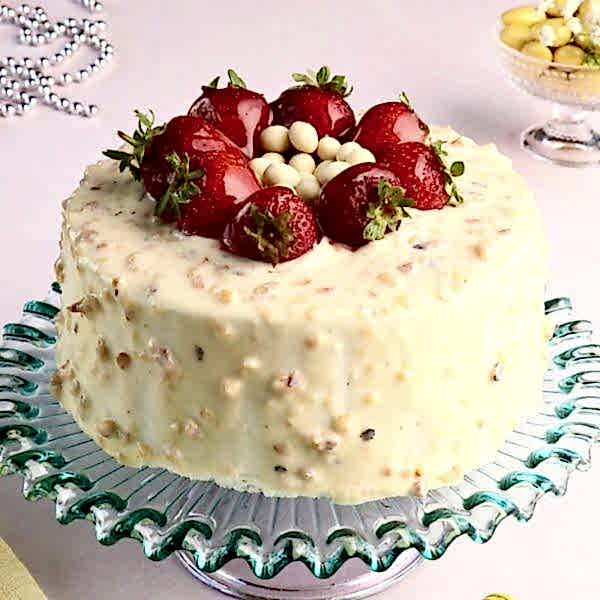 Cake decorated with parfait cream accompanied by plain sponge cake layers and covered with hazelnuts, covered with strawberries and ivory chocolate.