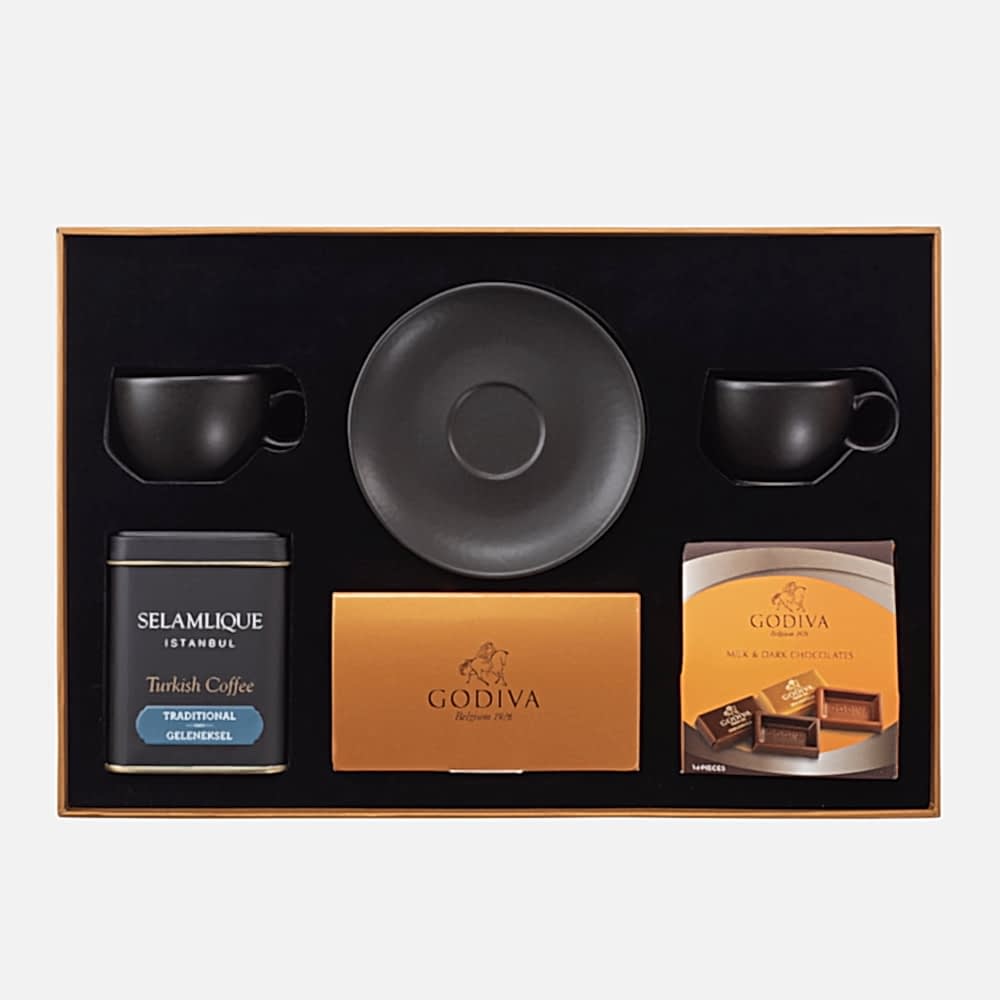 Set of two porcelain cups in a special gift box offers a unique experience with Selamlique Turkish coffee, GODIVA wrapped madlen and Neapolitan chocolates. It is specially designed as a wonderful gift for your loved ones or for the moments where you can pamper yourself.